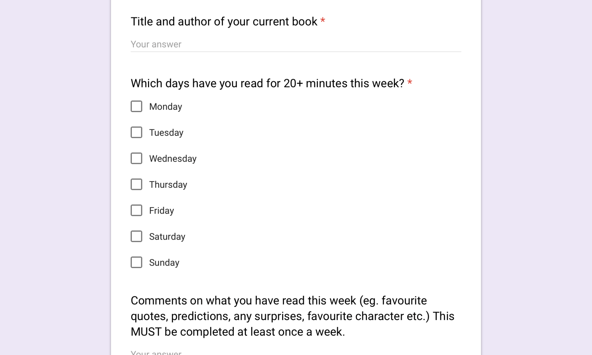 Each week the same link is sent out to all students in KS3 to complete. They follow a series of questions: the first page asks for their English teacher and their year group, the second page asks them to select their name from the year group list (divided by tutor group/classes) and to answer the following questions.