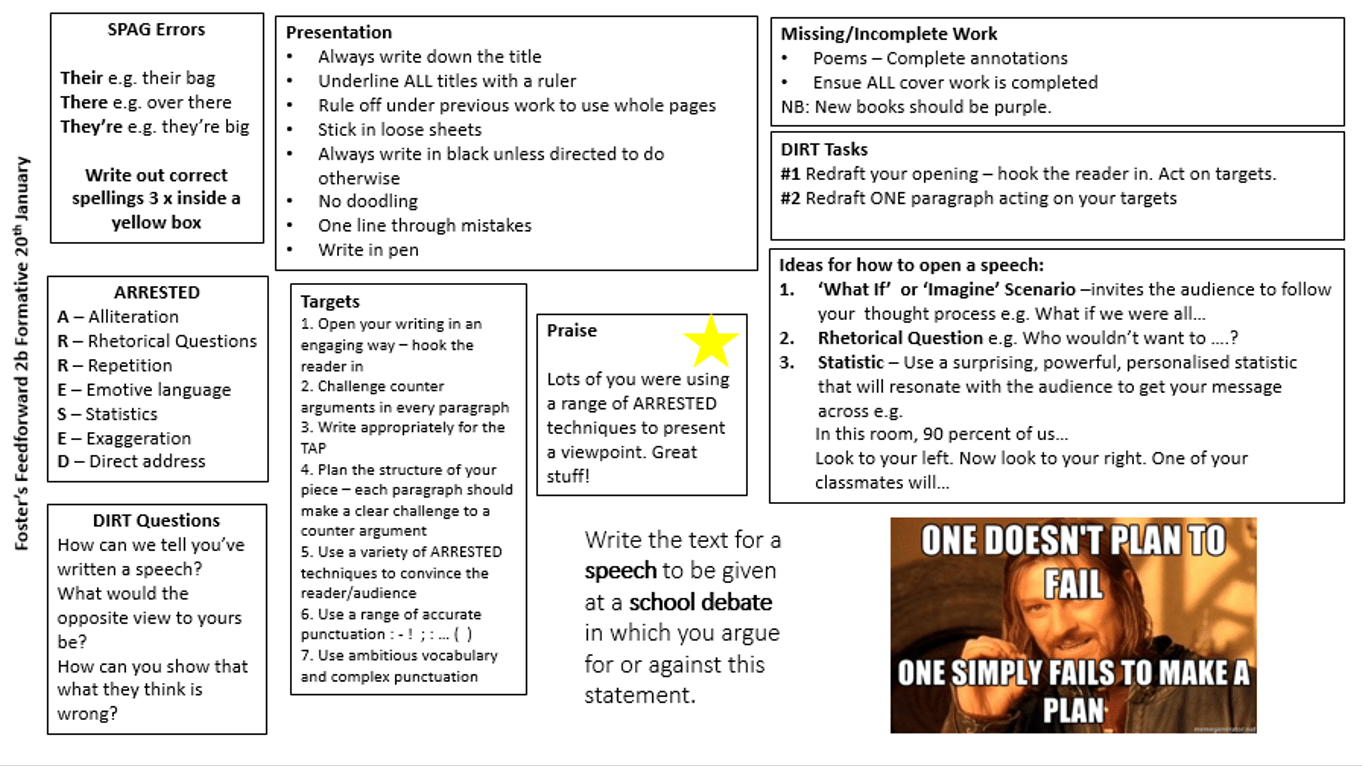 We have combined the feedback to fit the purpose of both giving feedback on formative assessment and addressing things like SPAG and presentation issues. I understand your arguments about focusing on improved learning outcomes but I don’t want teachers double marking books (once for the assessment and another time for SPAG and presentation etc). Besides, students should always present their work with care and try and ensure their spelling, punctuation and grammar is accurate.