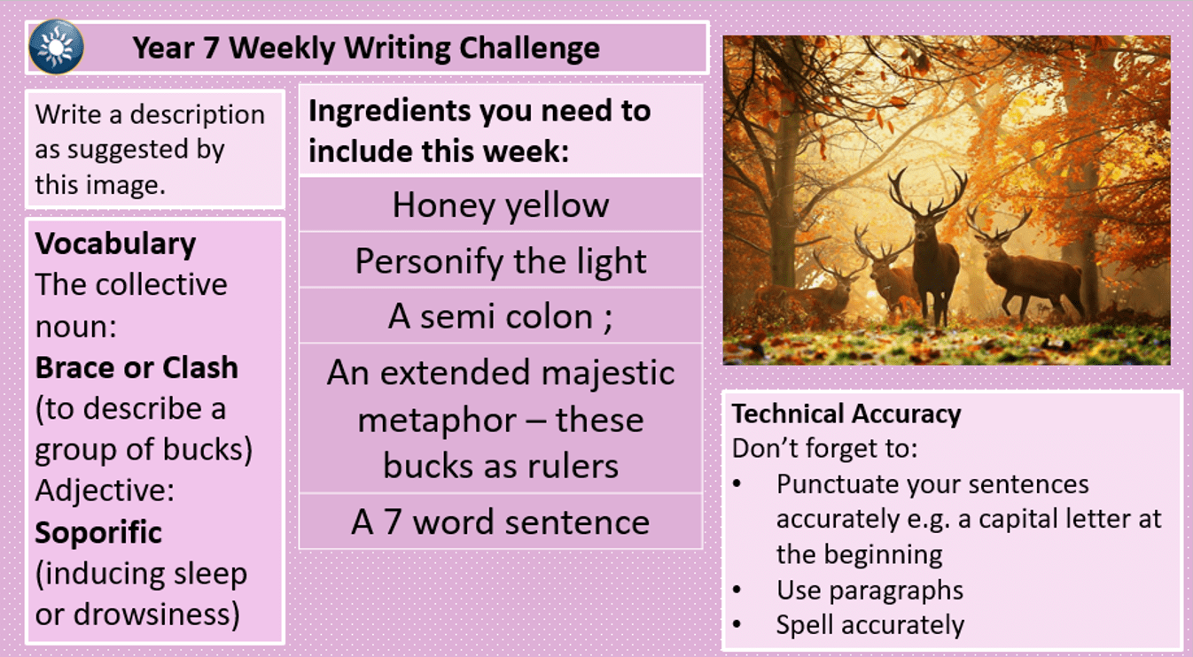 In class we have 5 mins for the vocab test and then the teacher will talk through the challenge and model anything that needs modelling or show an example e.g. of anaphora. Students will then have 5 mins to plan and 25 mins to write a response. Following this there’s peer and/or self assessment before we share a couple with the class.