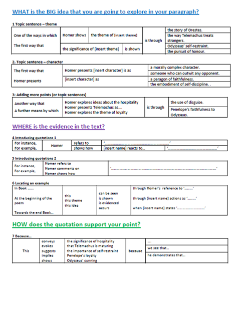Here’s an example year 7 sentence stem sheet for The Odyssey. We’ve adapted Lyndsey’s sentence stems to fit more closely with the approach we’ve been using in our department (e.g. the inclusion of sentence stem 7). Essentially what students do is build up their sentence stems using this as a support – they use some of the phrases as they appear but they add parts (e.g. [insert theme]) and change the parts of the sentence that given an idea of things you might say (e.g. the story of Orestes) because these are just included to give an idea of how a sentence might be structured.